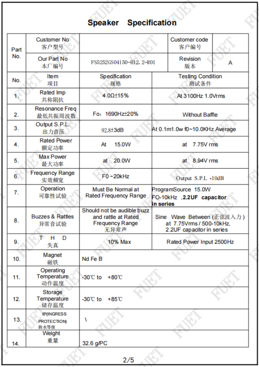 阻抗 | 4.0Ω±15% | At 3100Hz 1.0Vrms |
